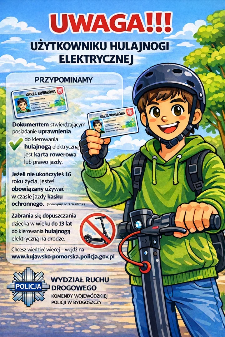 3.03.2026 r. wprowadzono regulacje, które podnoszą minimalny wiek użytkownika hulajnogi elektrycznej i urządzeń transportu osobistego do 13 lat. Jak podaje Policja: