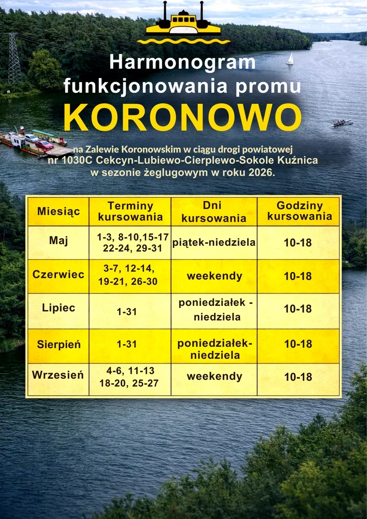 Na Zalewie Koronowskim znów rusza przeprawa, która skraca drogę i otwiera wygodny skrót między dwiema stronami akwenu. Prom „Koronowo” ma rozpocząć sezon 1 maja, a wraz z nim wracają kursy, dobrze znane tym, którzy planują wiosenne i wakacyjne wypady nad wodę. To połączenie między powiatem bydgoskim i powiatem tucholskim działa tylko w wybrane dni, więc warto wcześniej sprawdzić rozkład.
