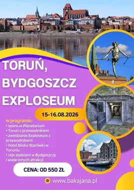 Weekend ma typowo „city breakowy” charakter: poranny wyjazd, potem chwile spędzone na toruńskiej starówce i nad Wisłą, nocleg blisko atrakcji, a kolejnym dniem wycieczka do Bydgoszczy z wizytą w Exploseum — miejscu, które łączy historię przemysłu i tajemnic II wojny światowej.